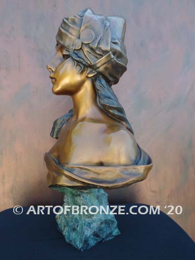 Art of Bronze is honored to present this exceptional bronze bust of Queen Scheherazade, a masterful tribute to the iconic storyteller from the Arabian Nights. This classical sculpture beautifully captures her grace and mystique, featuring her hair elegantly wrapped in a detailed headscarf adorned with coin-like pins. Flowing locks cascade over her right shoulder, complementing a low-cut bodice that swirls seamlessly into the base. Inscribed on the base is Mille et une Nuits—“A Thousand and One Nights,” a nod to the timeless tale that inspired this masterpiece. Originally sculpted in France around 1900 by Emmanuel Villanis (1858–1914), this work of art carries the legacy of the Art Nouveau era.