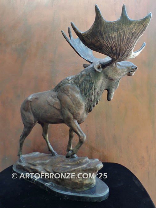 Art of Bronze proudly offers this beautifully crafted bronze sculpture of a standing moose, captured in a moment of wild expression. With his head lifted high, the moose appears to be getting ready to proudly bellow proudly into the mountain air—a powerful symbol of the untamed wilderness.