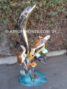 Introducing a captivating piece from Art of Bronze, this beautifully colored bronze sculpture features a dynamic scene of a leaping dolphin and her calf, surrounded by an array of vibrant sea life. This stunning artwork is more than just a statue; it’s a celebration of the ocean’s beauty and vitality, designed to become a striking focal point on your property.
