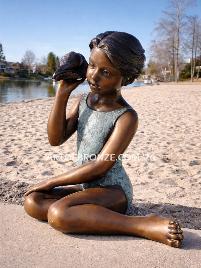 The sculpture portrays an adorable young girl in a classic summertime bathing suit, gently holding a beautifully detailed conch shell to her ear as she listens to the imagined whispers of the sea. Her relaxed pose conveys a sense of calm wonder, while the intricate sculpting of her long-braided hair demonstrates the exceptional craftsmanship and artistic detail for which Art of Bronze is known.