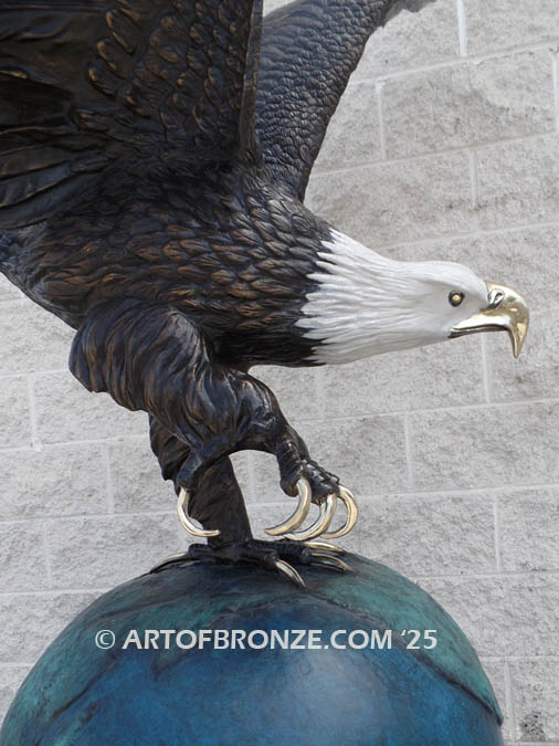 The eagle is shown with one set of talons firmly grasping Mother Earth, while the other set extends outward in mid-action. Its wings are fully outstretched, conveying power, motion, and dominance. Exceptional attention to detail is visible throughout the sculpture—from the layered feathers and defined musculature to the expressive head and sharply sculpted talons—reflecting Art of Bronze’s uncompromising standards of craftsmanship and quality.