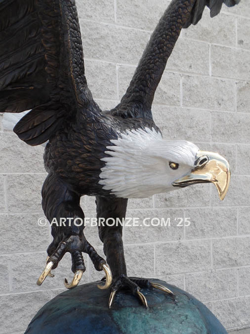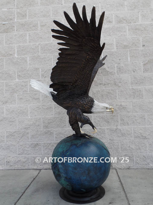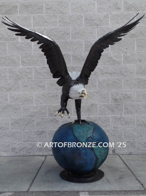 Art of Bronze proudly presents this commanding bronze sculpture of a bald eagle swooping down upon a patinated bronze globe of Earth. The dramatic composition symbolizes strength, guardianship, and global vigilance, making it a powerful statement piece for both private and public spaces.