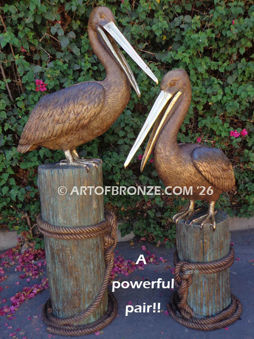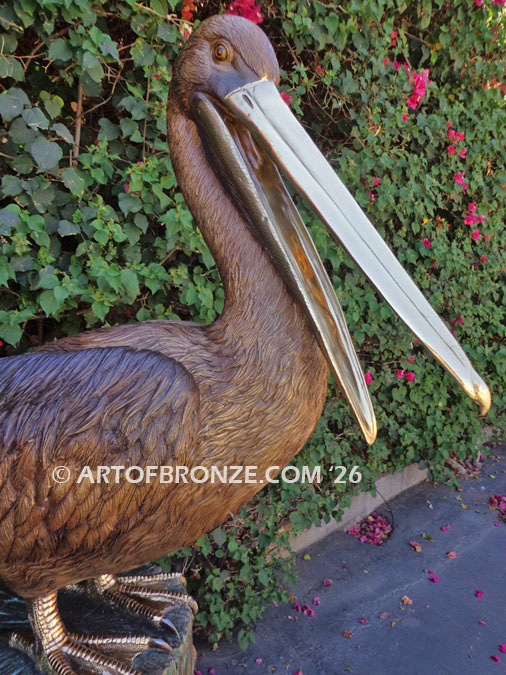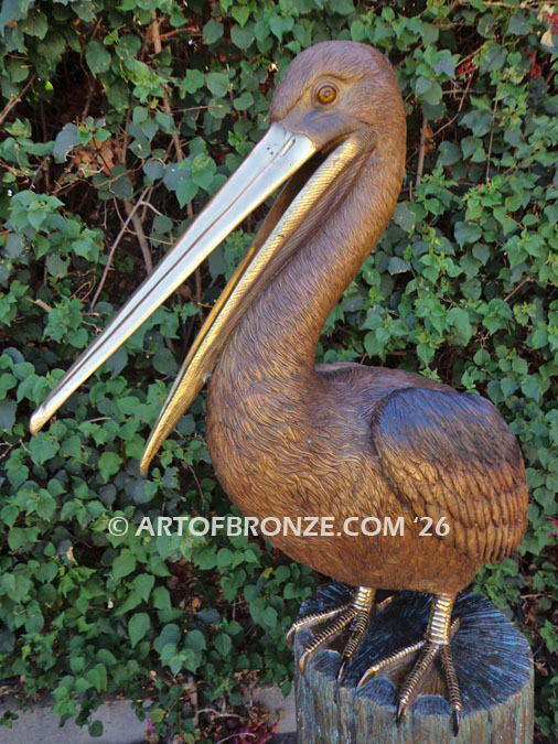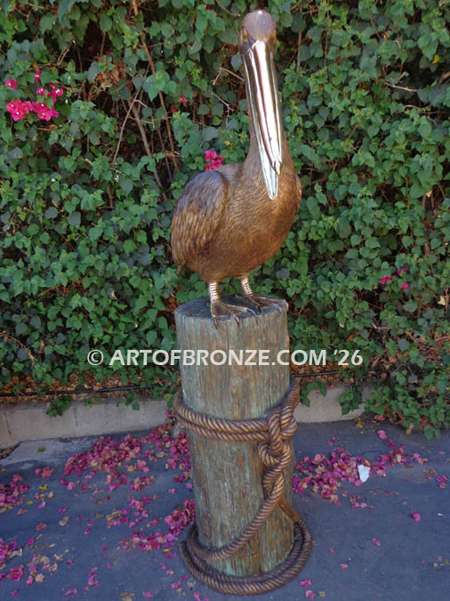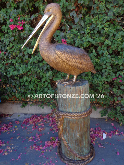 Call Art of Bronze today at (805) 908-5355 to learn more about our- outdoor bronze large water bird statues – bronze pelican on piling sculpture – regal standing pelican bronze statue – Audubon bronze artwork.