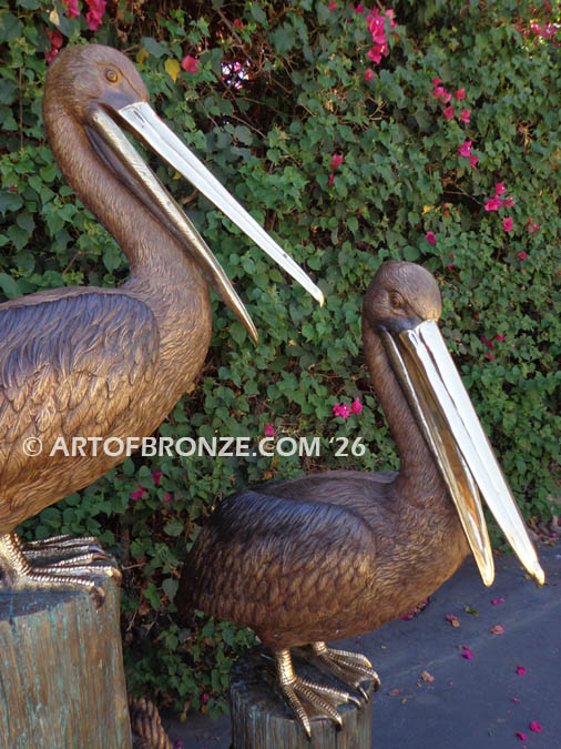 Call Art of Bronze today at (805) 908-5355 to learn more about our- outdoor bronze large water bird statues – bronze pelican on piling sculpture – regal standing pelican bronze statue – Audubon bronze artwork.