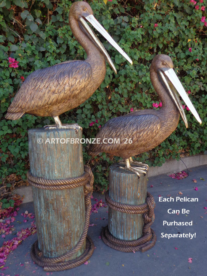 This delightful bronze sculpture set features two large pelicans playfully perched atop their own sculpted bronze pilings. Each piling is beautifully detailed with realistically wrapped rope, creating a nautical character that enhances the overall composition. The pelicans’ expressive postures and lifelike stances bring a sense of motion and personality to the pair, while exceptional craftsmanship is visible in every feather, curve, and surface texture.