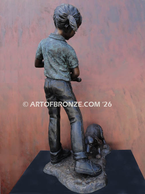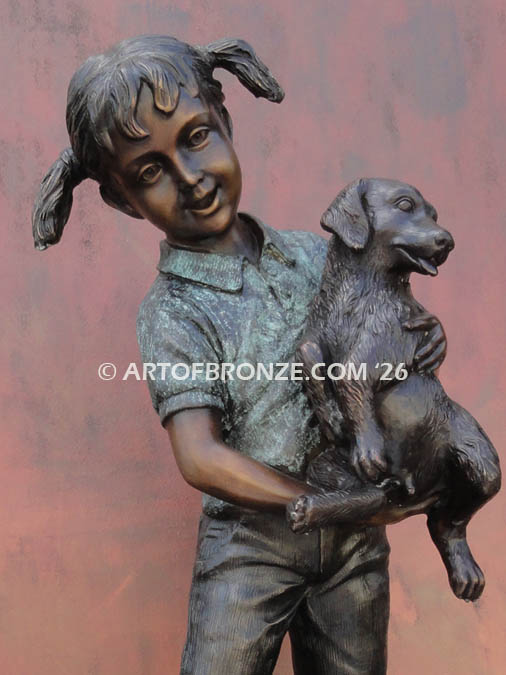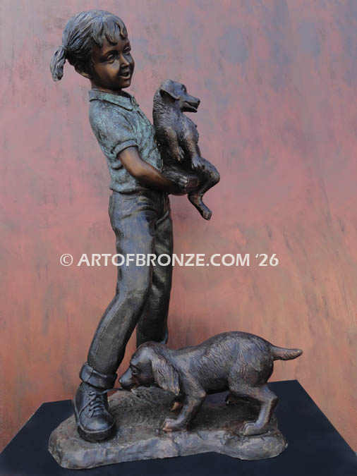 Call Art of Bronze today at (805) 908-5355 to learn more about our- outdoor bronze children’s statues – girl playing with dogs bronze statue – canine and kids bronze statue – outdoor children playing with dogs sculptures – bronze girl holding dog bronze statue.