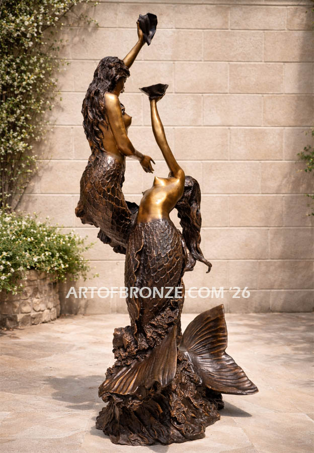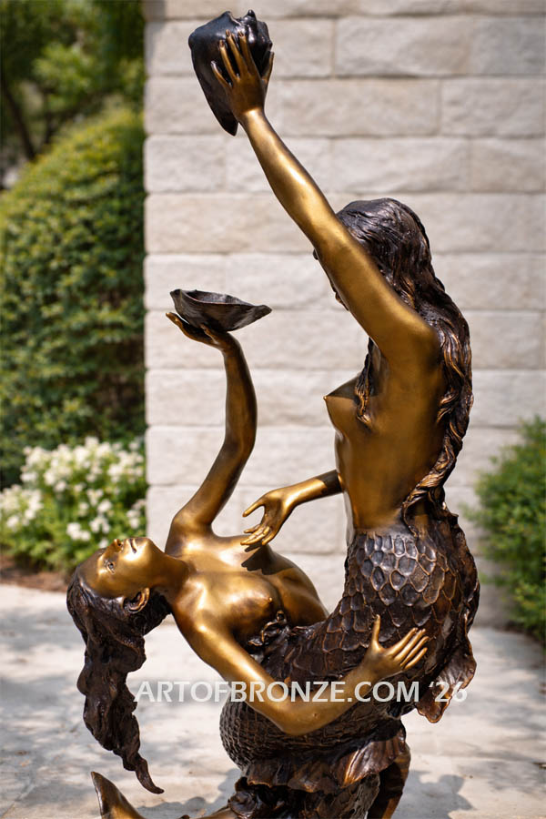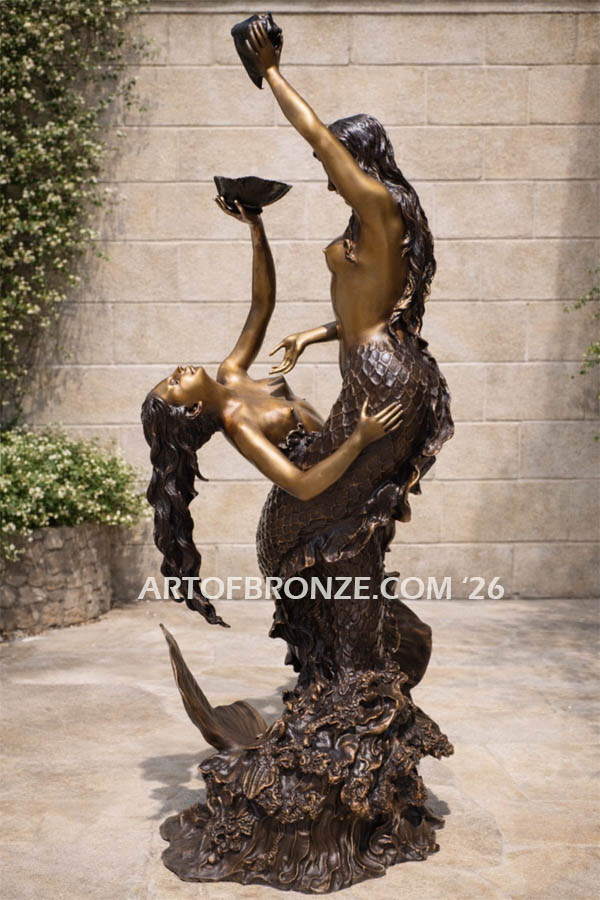 Poseidon’s Temptation is a breathtaking bronze mermaid fountain sculpture featuring two gracefully intertwining mermaids brought to life through vibrant custom patina coloration. This captivating mythological composition evokes the romance and mystery of the sea, with elegant movement that draws the eye upward through the fluid interaction of the figures.