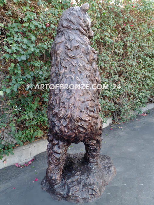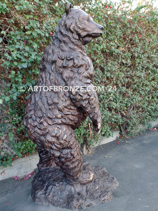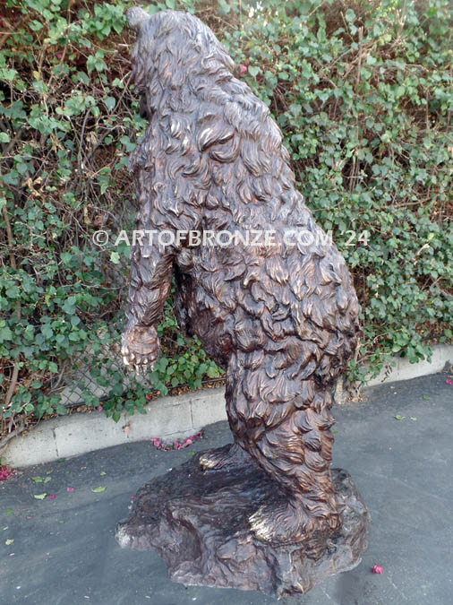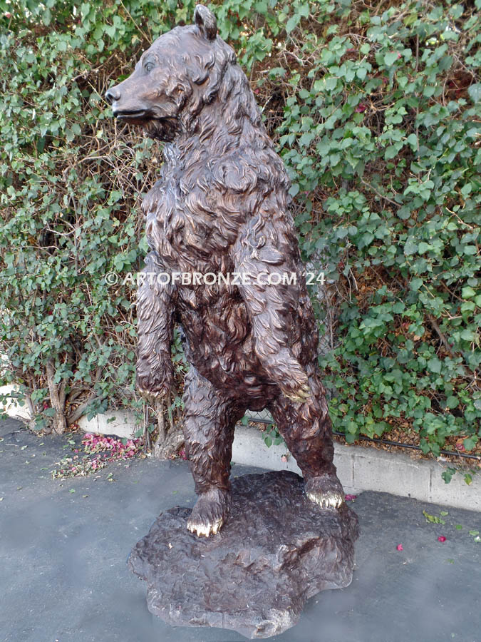 Standing approximately 6 ½ feet tall, the sculpture creates a dramatic focal point ideal for estates, lodges, ranch properties, parks, corporate campuses, and nature-inspired landscapes. The bear is securely supported by a sculpted bronze rock base, providing both visual balance and structural stability for long-term indoor or outdoor display.
