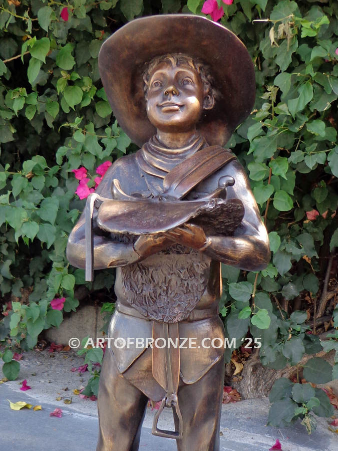 Art of Bronze presents this charming bronze young cowboy statue capturing the timeless spirit of the American West. Full of personality and warmth, this delightful sculpture features a young cowboy proudly holding his saddle with both hands while gazing upward with an optimistic smile. His confident stance and cheerful expression embody the adventurous “Wild West Spirit,” bringing character and storytelling to any space.