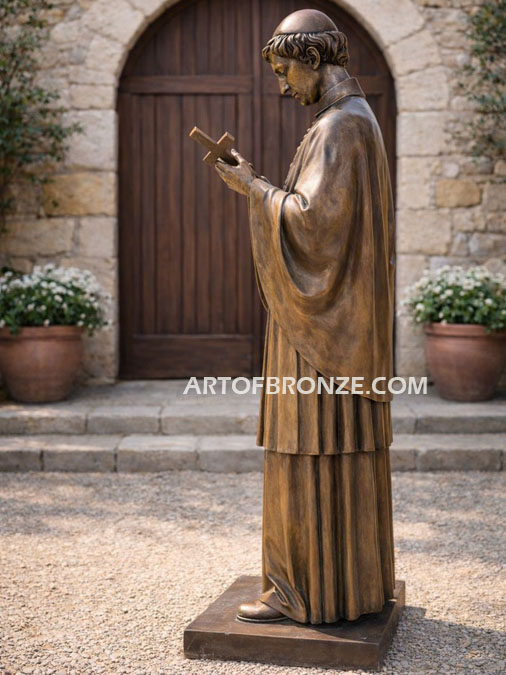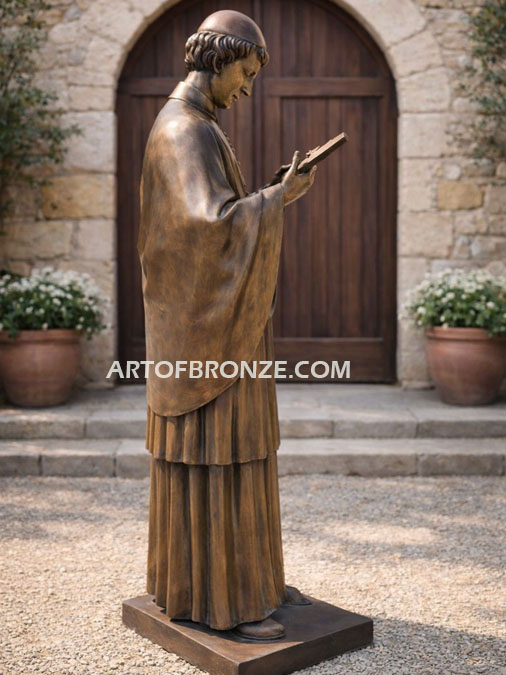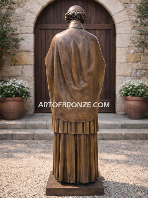 The entire figure is securely mounted on a bronze base, making it ideal for display in churches, private chapels, academic institutions, and sacred outdoor spaces. Every inch of this sculpture reflects attention to detail, from the quiet expression of contemplation to the graceful stance of the garments at his feet.