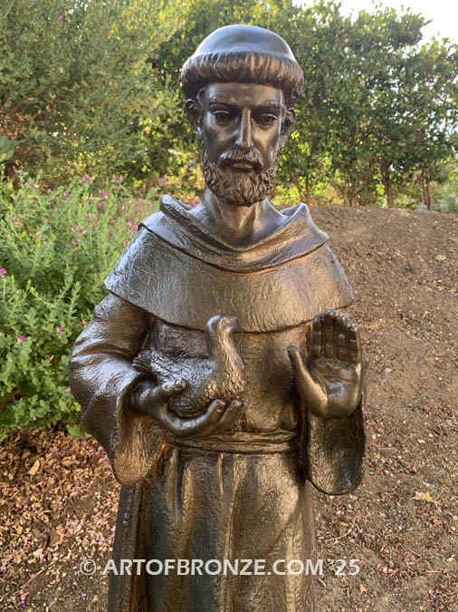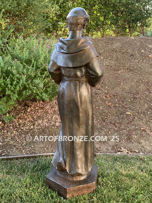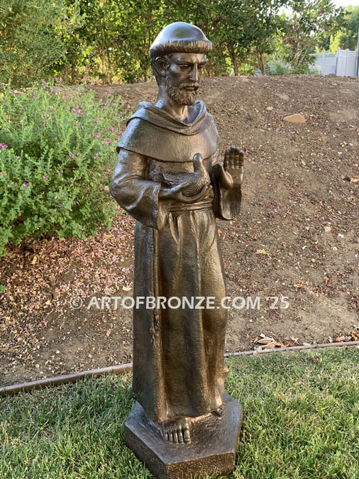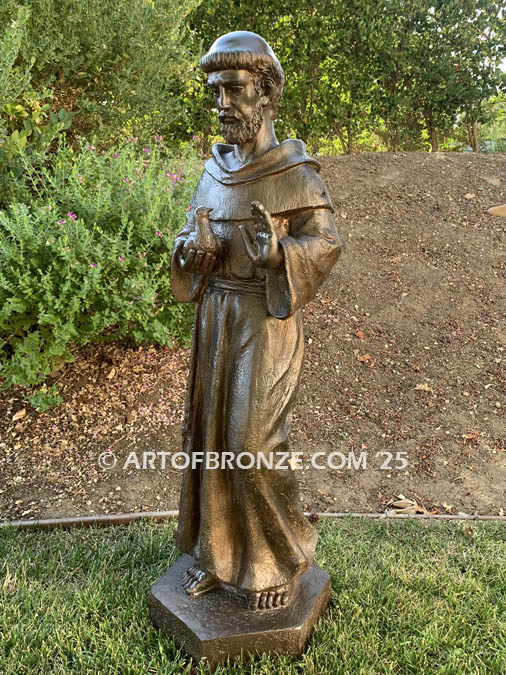 Art of Bronze is honored to offer this exquisite bronze statue of Saint Francis holding a dove. Saint Francis is sculpted standing upright, wearing the simple hooded robe, rope belt, and sandals typical of a peasant’s attire. In his right hand, he holds a dove, symbolizing faith and purity, while his left hand is raised in a gesture of blessing. The statue stands atop a beautifully designed hexagon base.