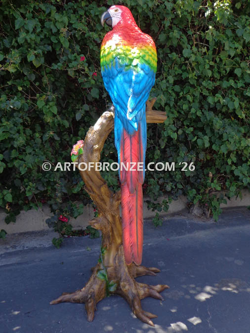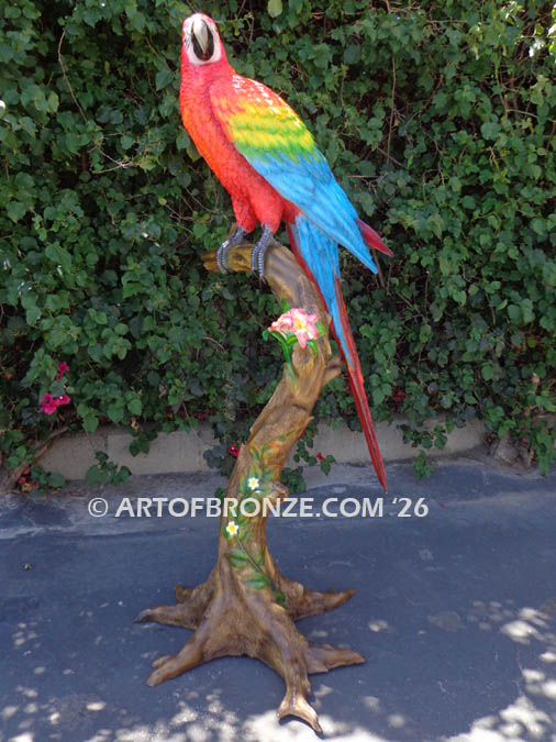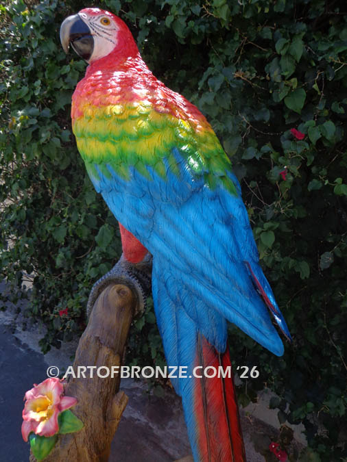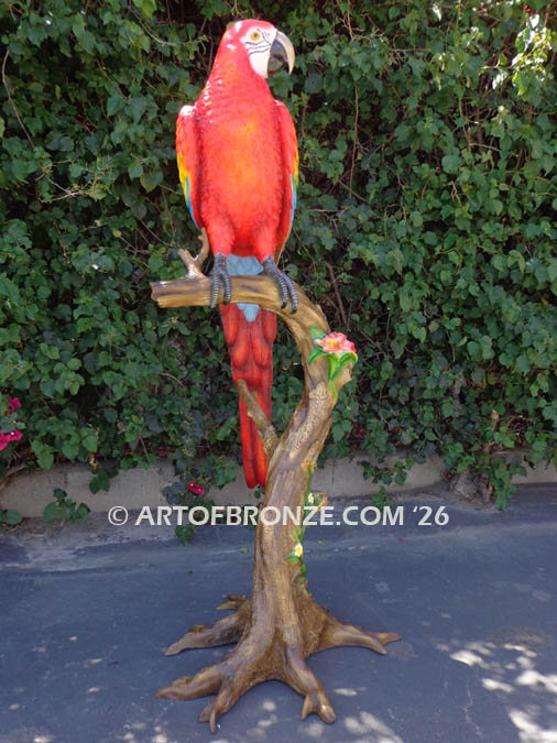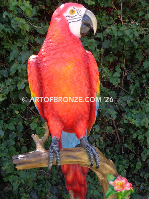 • Scarlet Macaw outdoor bronze statue of life-size wild Macaw on a branch