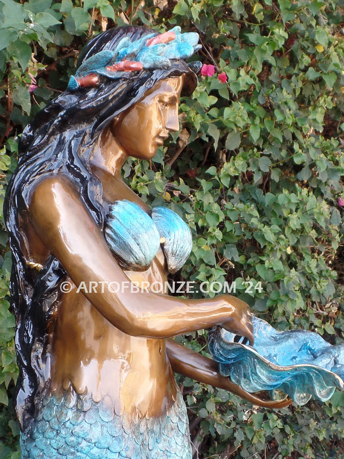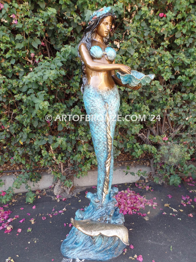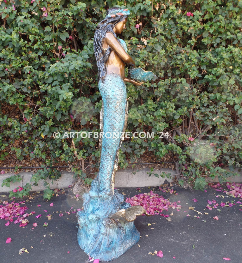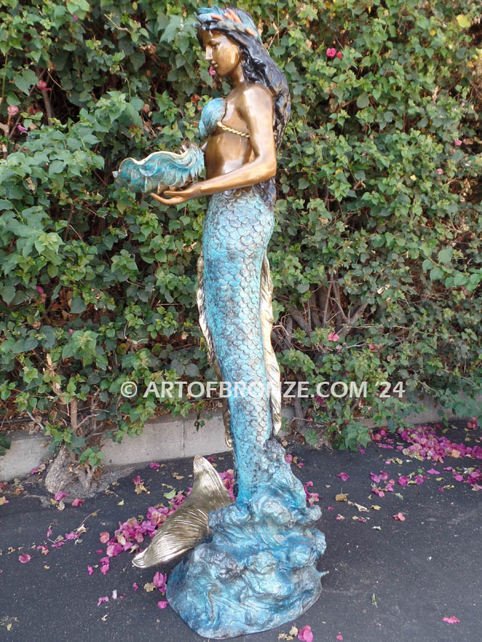• Bronze mermaid sculpture holding oyster shell for pond, pool or aquatic display