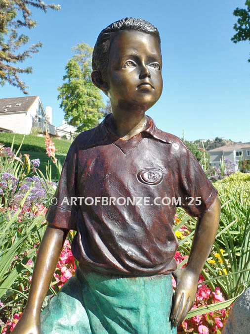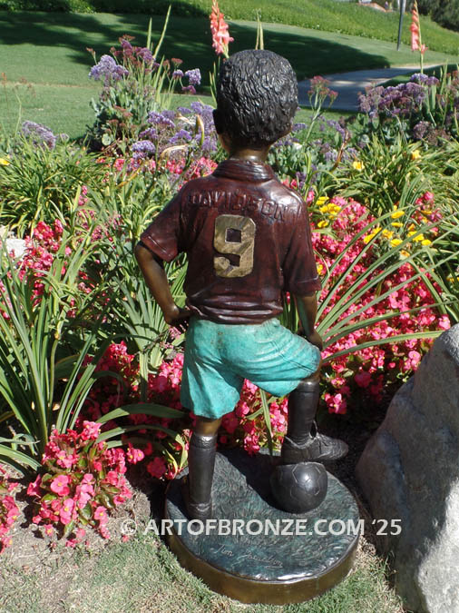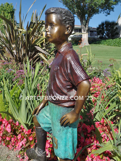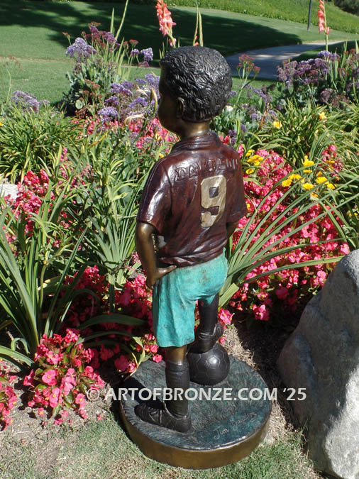 The boy stands with the soccer ball resting beneath his right foot, a classic pose that reflects determination and readiness. His short, cropped haircut and natural stance add realism and charm, while the fine detailing throughout the sculpture highlights the exceptional craftsmanship and attention to detail for which Art of Bronze is known. From the folds in the uniform to the texture of the cleats and ball, every element is thoughtfully rendered in enduring bronze.
