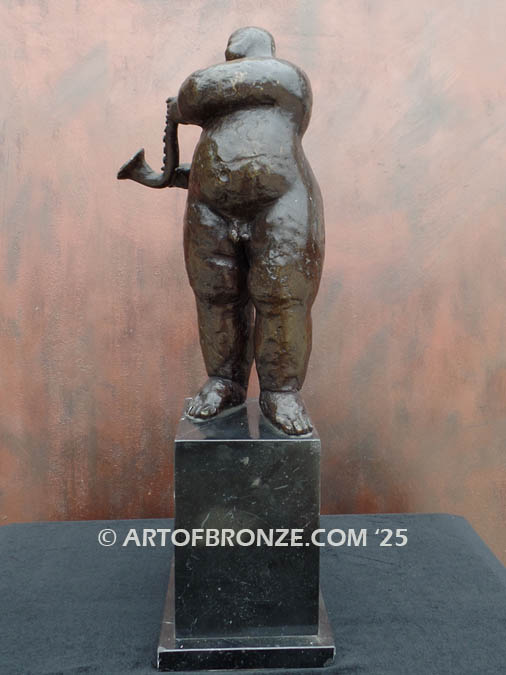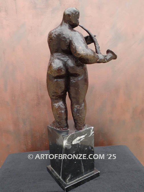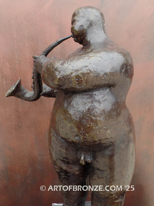 This expressive bronze sculpture captures the raw emotion and rhythm of live jazz music through a bold, contemporary form. The musician is portrayed mid-performance, fully immersed in the act of playing his horn, with exaggerated proportions and textured surfaces that emphasize movement, sound, and soul rather than strict realism. The rich, hand-worked bronze patina adds depth and character, allowing light to play across the sculpted planes and enhance its dynamic presence.