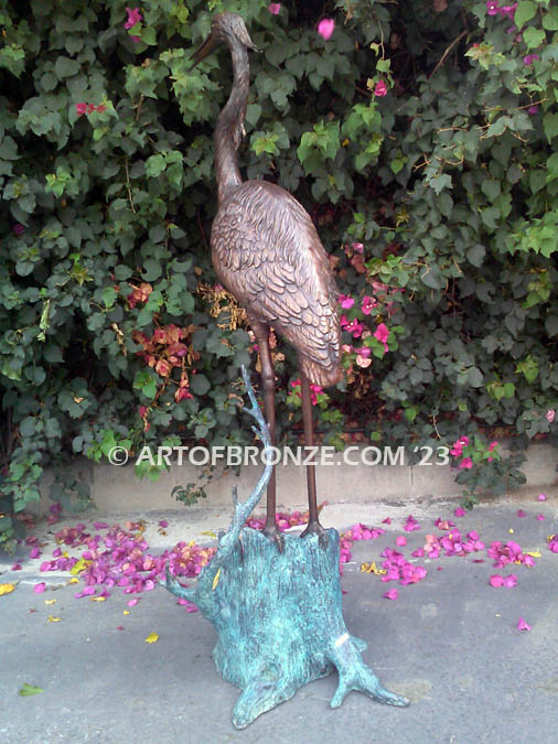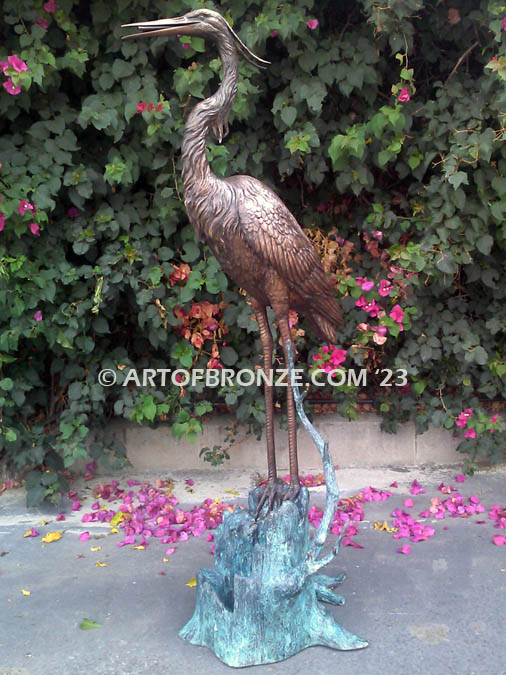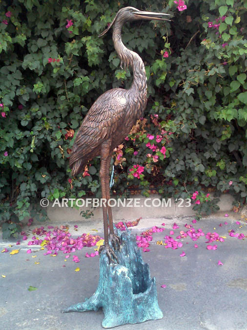 Art of Bronze invites you to add a graceful and elegant touch of distinction to your property with this beautiful bronze heron sculpture. Peacefully posed atop a sculpted bronze tree trunk, the heron stands tall and composed, capturing the quiet serenity and refined beauty of this beloved shoreline bird.