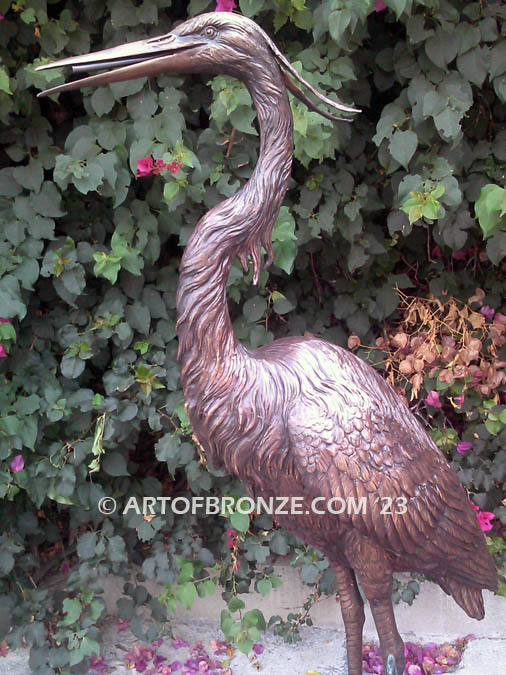 Its long, slender legs and gracefully extended neck — signature traits of the heron — are masterfully proportioned to create a balanced and natural silhouette. Every feather is diligently sculpted with careful attention to texture and detail, showcasing the craftsmanship and artistry that define Art of Bronze works. The composition evokes stillness and poise, making it an ideal focal point for tranquil outdoor settings.