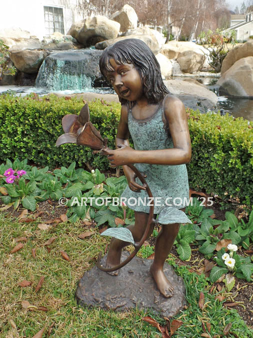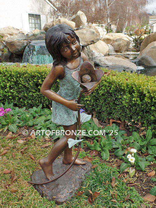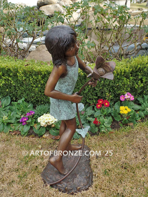 Delight in the sense of wonder and imagination captured in this charming bronze sculpture of a young girl holding an oversized flower. With a joyful expression on her face, the girl stands in her summer dress, gazing at the magical bloom cradled gently in her hands. The exaggerated scale of the flower adds a whimsical, storybook quality, evoking fantasy, innocence, and the boundless creativity of childhood.