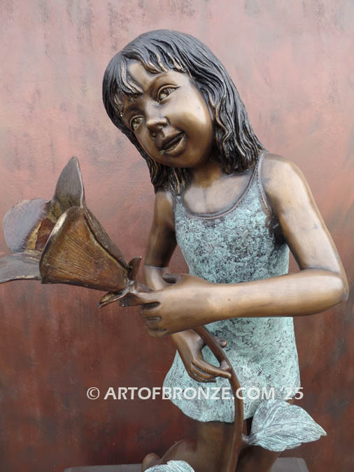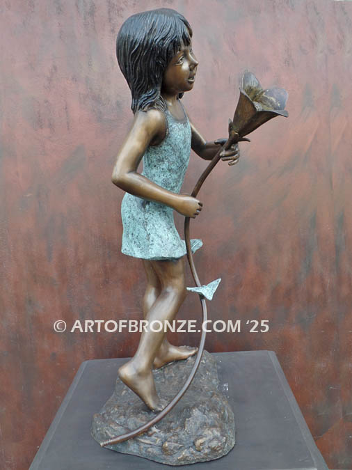 Delight in the sense of wonder and imagination captured in this charming bronze sculpture of a young girl holding an oversized flower. With a joyful expression on her face, the girl stands in her summer dress, gazing at the magical bloom cradled gently in her hands. The exaggerated scale of the flower adds a whimsical, storybook quality, evoking fantasy, innocence, and the boundless creativity of childhood.