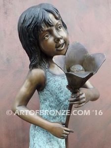 Joyful, charming, and wonderful are just a few words that describe this young girl playing with a giant flower. Enjoy this forever in your home or garden. Call Art of Bronze today at (805) 908-5355. Copper tubing pre-installed allows water to shoot or flow from the center of the flower if you decide to display outdoors.