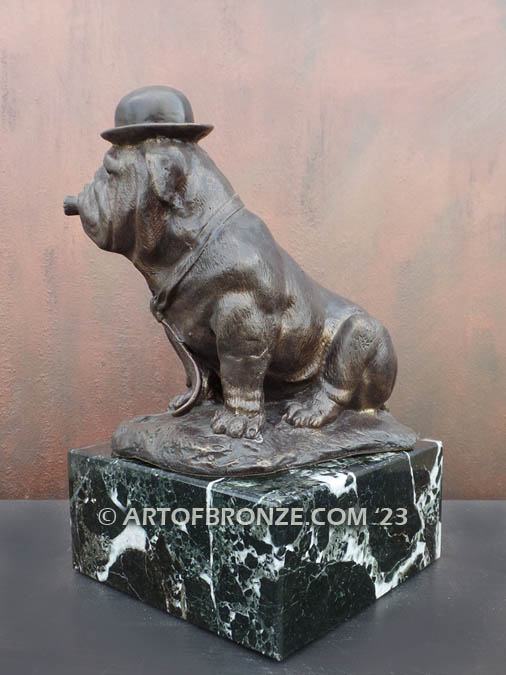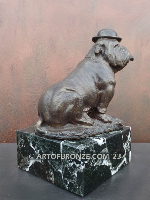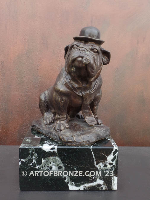 Art of Bronze proudly presents this whimsical bronze sculpture of a cigar smoking bulldog, a delightful fusion of humor, charm, and fine craftsmanship. This distinguished pup sits back in relaxed confidence, a cigar tucked between his jaws, wearing a bowler hat and a loosely draped tie — the very picture of canine sophistication.