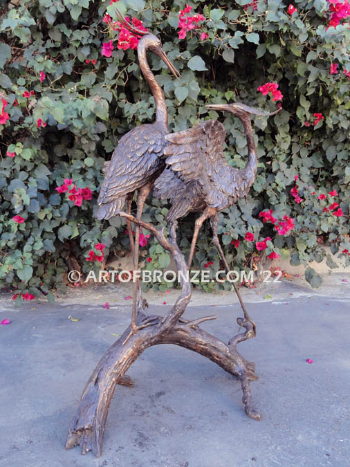 Art of Bronze invites you to add a romantic and refined touch to your property with this enthralling bronze composition of two courting herons. Gracefully balanced atop a sculpted bronze log, the pair is captured in a tender display of courtship. The male heron stands attentively, his posture forward and alert as he gazes toward his female companion, creating a scene filled with quiet connection and natural elegance.