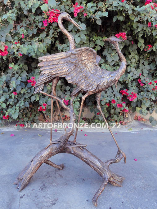 The herons feature loosely sculpted feathering, intentionally designed to convey softness, movement, and emotion throughout the composition. Their long legs and gracefully extended necks create a beautiful vertical rhythm, while the textured log base grounds the sculpture with organic realism. The overall effect is both sophisticated and expressive — a timeless portrayal of partnership in nature.