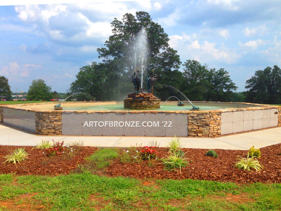 These herons were custom created for Carolina Cemetery Park, where they serve as the centerpiece of the Heron Columbarium Fountain. In this impressive installation, water sprays upward from each heron’s bill, complemented by a central nozzle and three bronze frogs positioned around the base, playfully spraying water back toward the herons. Together, the elements create a dynamic, interactive, and visually striking water feature.