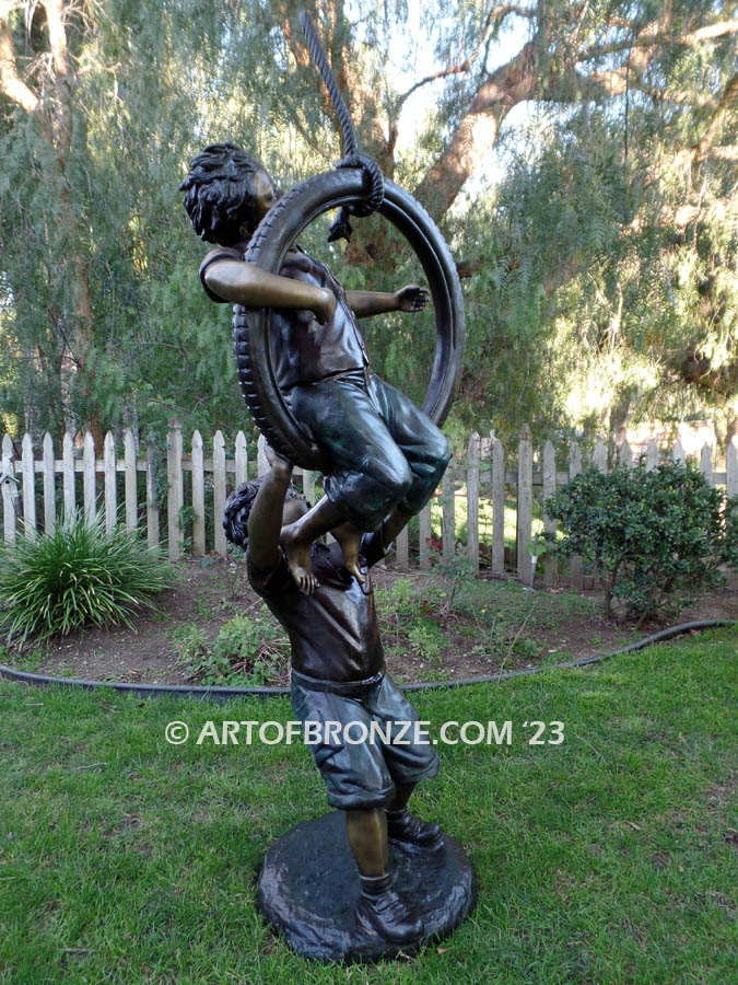 Art of Bronze beautifully captures the carefree spirit of childhood in this heartwarming bronze children tire swing sculpture. This engaging composition features two boys sharing a joyful moment — one seated in the tire swing with an exuberant expression, while the other stands firmly on the ground, pushing his friend with playful energy. The natural interaction between the figures brings movement, emotion, and storytelling to life.