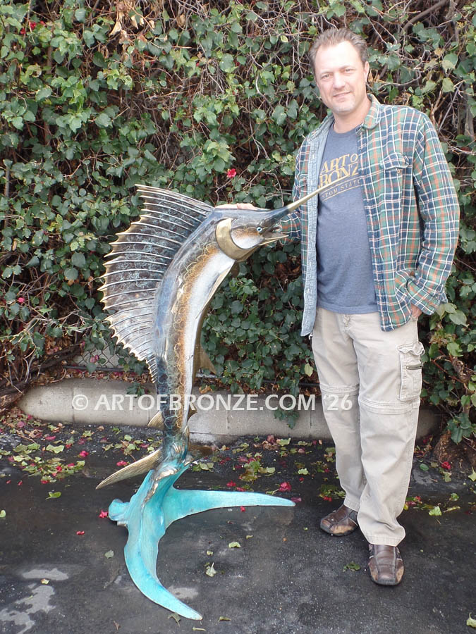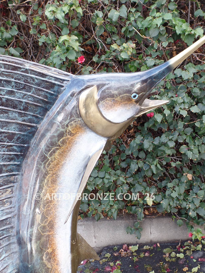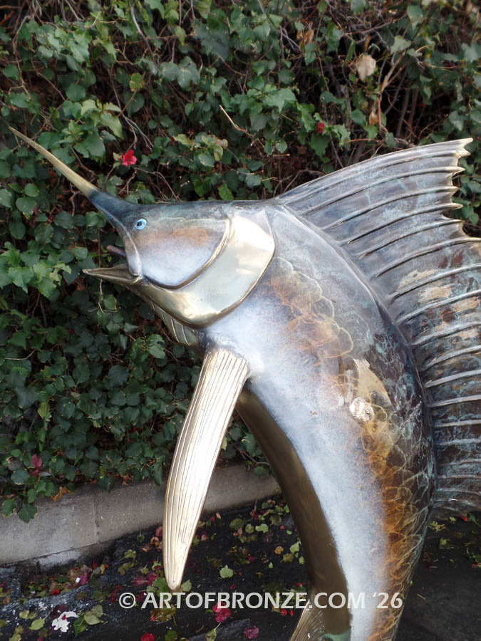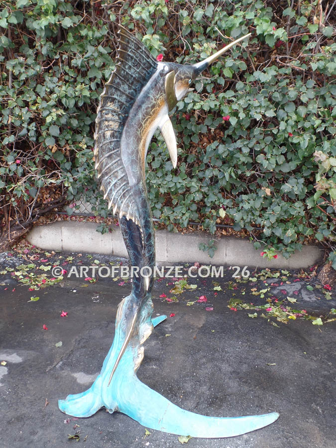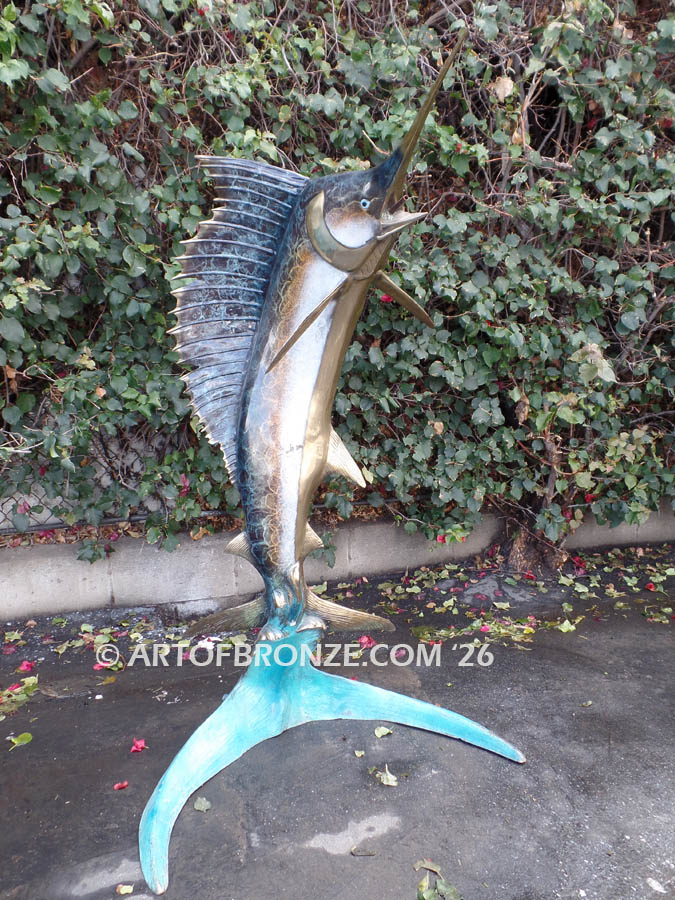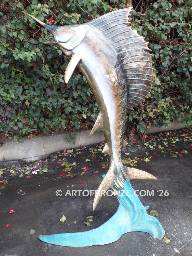 • bronze statue leaping sailfish that can spray water from bill into estate fountain