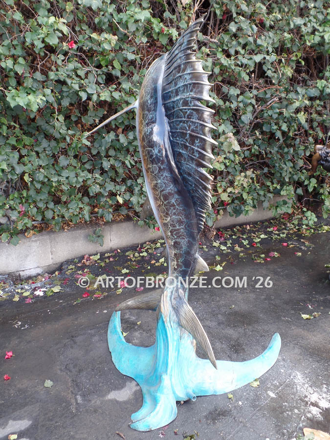 Admire the dynamic curved body shape of this 4 ½ ft. tall bronze sailfish statue as he leaps out of the bronze designed water wave that supports the entire composition.  The sailfish is sculpted with stunning realism and has a gorgeous hand-finished patina coloring.  This dynamic sailfish sculpture perfectly captures the fastest animal of the sea.  It is a true bronze treasure made for the Offshore sportfishing enthusiast.  The sailfish can have copper tubing inside its mouth to allow the discernible fountain sound of flowing or spraying water.