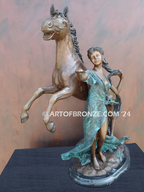 Every element of this sculpture reveals meticulous craftsmanship and emotional depth. The woman, draped in a flowing robe, reaches out to something off in the distance, while the stallion nuzzles close, expressing loyalty, trust, and companionship. The artist’s attention to fine detail — from the horse’s powerful musculature to the soft serenity in the woman’s face — brings this intimate moment vividly to life.