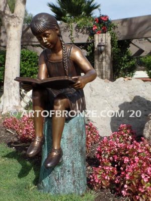 • Study Time bronze sculpture of young reader girl sitting on bronze stump